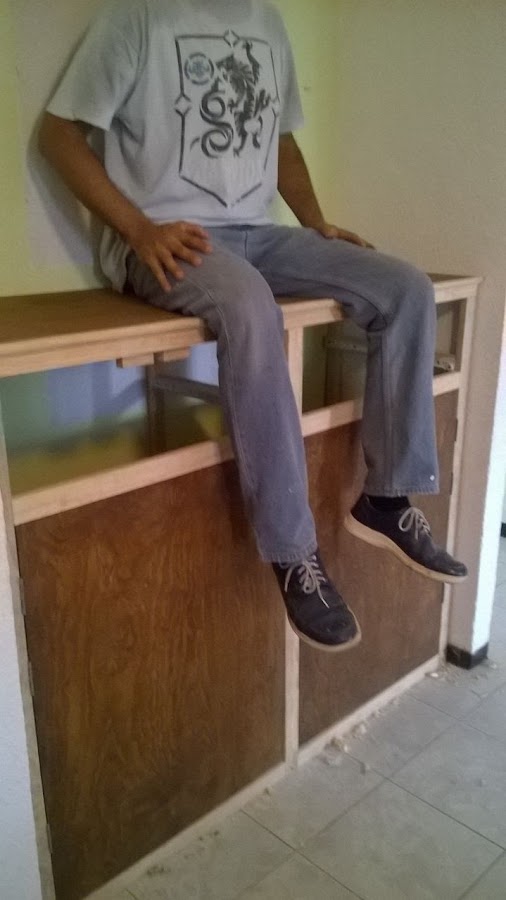 4. Ahora colocaremos los horizontales, igualmente midiendo uno por uno. Los colocaremos a la altura de donde vamos a colocar los rieles de los cajones asegurándonos que queden bien nivelados y fijos a los verticales ya que sostendrán el peso de los cajones y su contenido. Igualmente colocaremos los horizontales donde queremos que queden las repisas dentro de las puertas. Nosotros decidimos colocar dos de cada lado. Hubo que verificar la estructura, así que me atreví a subirme para probar con mi propio peso... afortunadamente resistió...