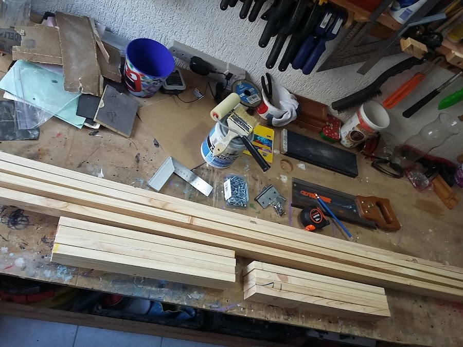 1. Una vez que se tienen los cortes comenzamos por colocar primero las cuatro piezas de 65mm x 40 cm desde la parte superior dejando espacio entre cada escalón de 40 cm igualmente. Para estos espacios se pueden usar los mismos escalones como separador para que la medida sea siempre uniforme - vale la pena recortar dos piezas adicionales de 40 cm, aunque sea de otro espesor, para que sirvan de separadores