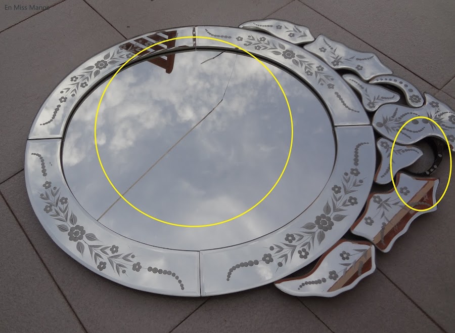 Hace ya un tiempo me encontré en el contenedor mágico un espejo un poco... digamos "abuelil", y que además estaba roto, tanto en la zona interior con dos rajas bastante visibles, como en una de las piezas de alrededor, que directamente faltaba.