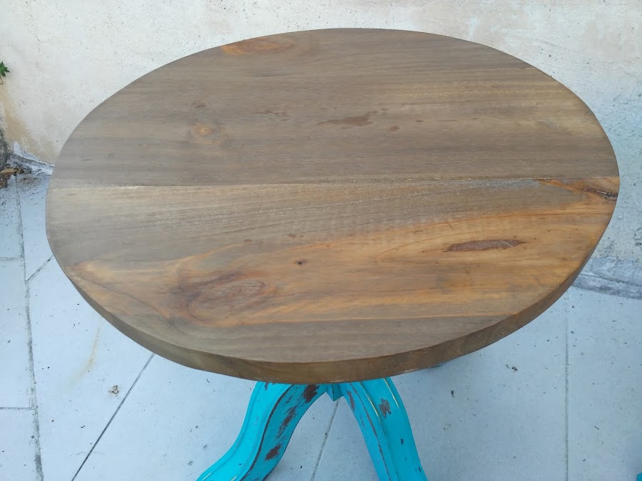 Las mesillas las quise de forma redonda en madera de pino con muchos nudos.