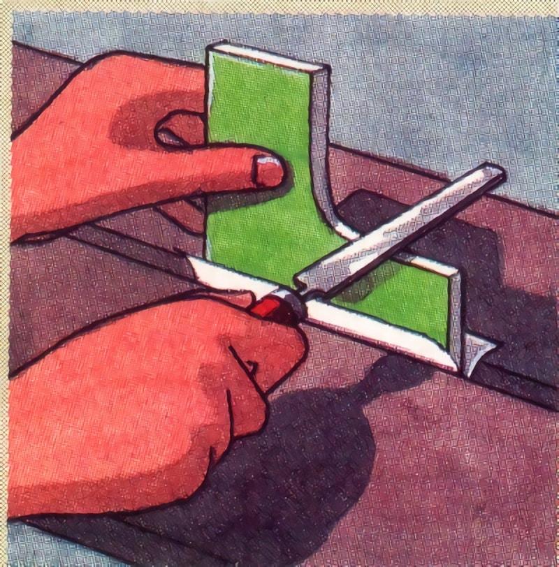 Lápiz, regla de acero o escuadra, cortador o tenaza de muesca, dos cerillas y lima para azulejos.