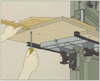 Use una ruteadora con una broca/fresa de cola de milano para cortar una canaleta de 1cm de profundidad en la mitad de la base del dispositivo. Después use la sierra sin fin para cortar un listón angulado, el cual va estar desplazandose suavemente en la canal. (Establezca el ángulo de la sierra midiendo el ángulo de los bordes de la canaleta). Corte una muesca en la sierra sin fin. Luego posicione la base del dispositivo en la mesa de la sierra de forma que la hoja de corte repose en la muesca y la canaleta cola milano sea perpendicular a la dirección del corte. A continuación atornille los brazos de soporte por debajo de la base del dispositivo; los brazos deben abrazar(encajonar) los lados de la mesa de la sierra. Taladre dos agujeros de tornillo a dos pulgadas del extremo sin muesca a través del fondo de la canaleta de cola-milano en la base del dispositivo; tambien perfore tres huecos a lo largo de la barra.
