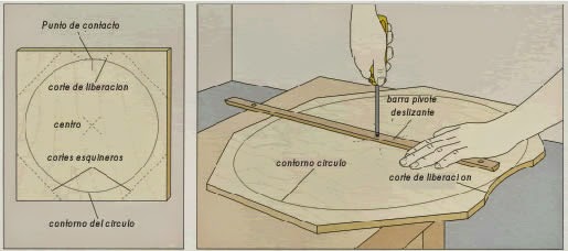 Haga un corte de liberación desde el borde de la pieza hasta la marca de la circunferencia y girela. Atornille la barra de pivotaje al centro de la pieza en uno de los orificios de la barra dejando el tornillo lo suficientemente suelto para que la pieza gire. Déle la vuelta y marque el punto de contacto en donde la hoja toca la circunferencia durante el corte de liberación.