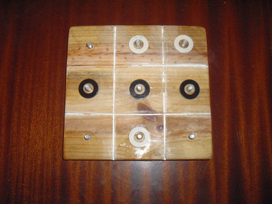 Unas arandelas pintadas serán las fichas que se irán colocando en las tuercas hasta conseguir el apreciado tres en raya.