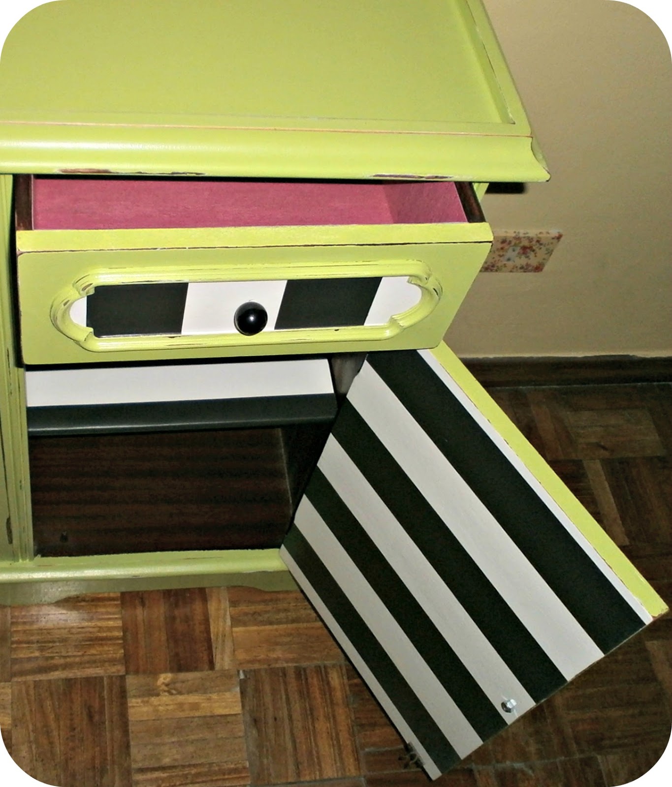 6- Decidimos adornar los cajones con papel de empapelar, pegamos con cola blanca diluída en agua, y pasamos un trapo para eliminar las posibles burbujas de aire