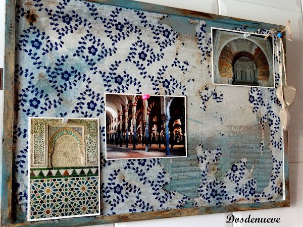 Tablero de corcho decorado con decoupage y pintura a la tiza