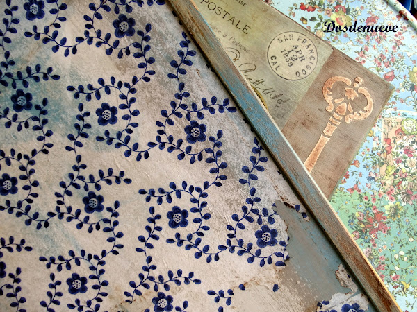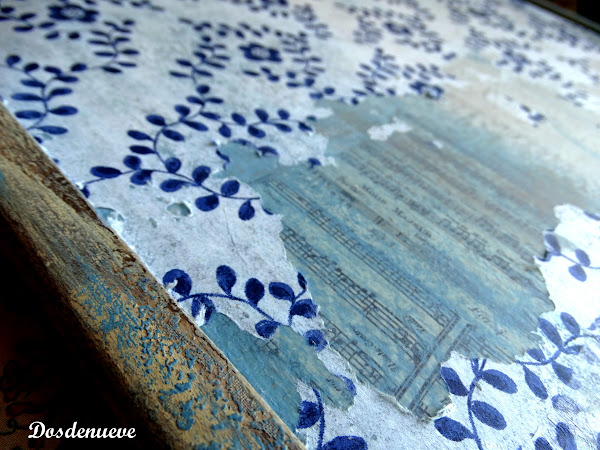 Cómo lo que intentábamos era simular el aspecto de una pared desgastada, con mucha historia, lo que hemos hecho es, a partir de la pintura a la tiza y el decoupage de servilleta, ir superponiendo capas de materiales diferentes, de manera que el resultado final nos recuerda a una habitación que ha sido pintada y empapelada en sucesivas ocasiones.