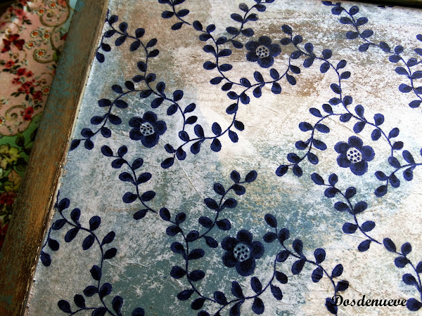 Volvimos a utilizar la técnica del decoupage pero esta vez con una servilleta de flores azules. La servilleta la rompimos con la mano en trozos de diferente tamaño y forma y la fuimos pegando con la cola especial de decoupage.