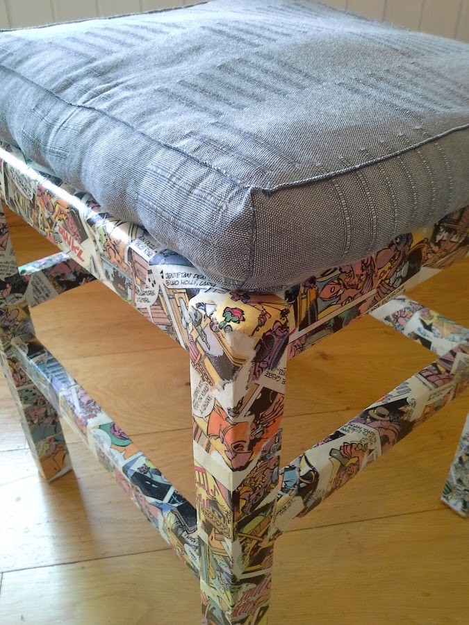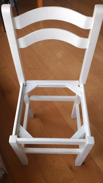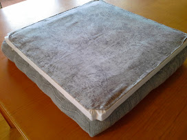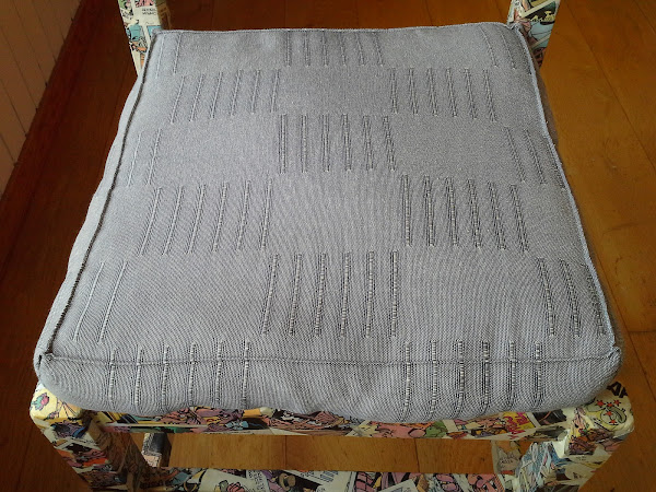 Para el asiento le hice un cojín fijado al asiento. Es decir, primero confeccioné la funda de lo que sería el cojín y lo rellené. El asiento original lo forré con tela de algodón y le fijé el cojín grapándolo al asiento (lo siento pero no tengo fotos del paso a paso, se me olvidó hacerlas durante el proceso...).