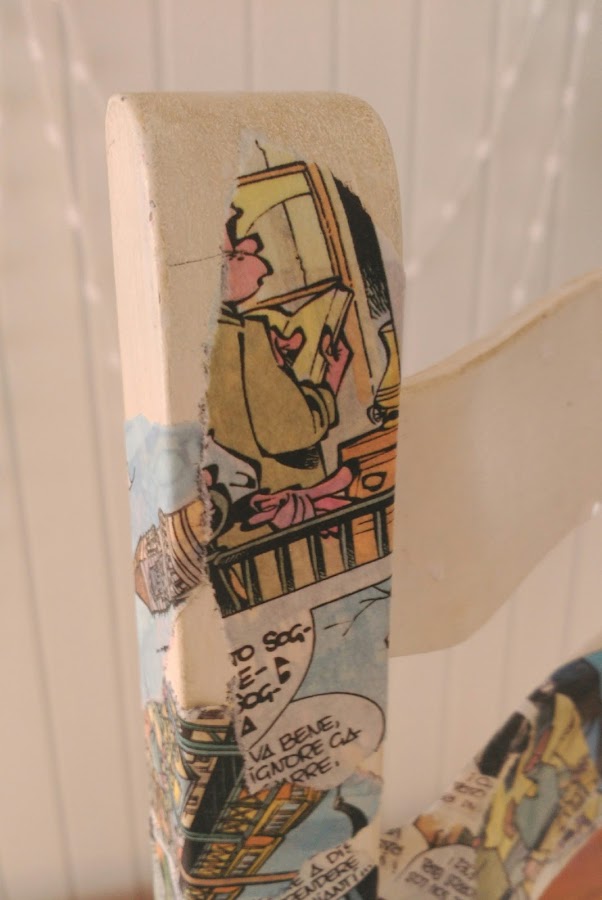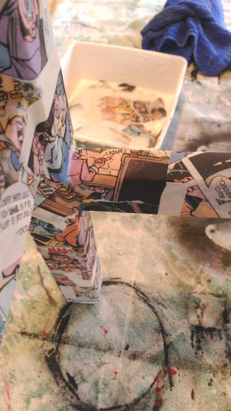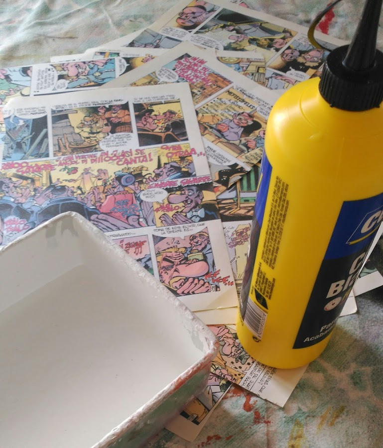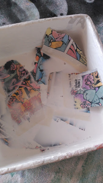 Con un comic troceado y una mezcla de cola blanca con un poco de agua comencé a trabajar introduciendo los pedazos de papel en la mezcla.