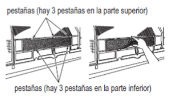 Hay que abrir el panel frontal tal como hemos hecho antes y retirar los filtros empujando hacia arriba y hacia abajo la pestaña del centro de cada filtro.