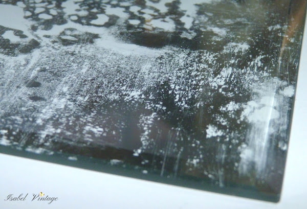 En esta primera prueba lo dejé secar tal como lo veis para ver bien si el aguafuerte funcionaba o no... veréis cómo quedó este pobre espejo...