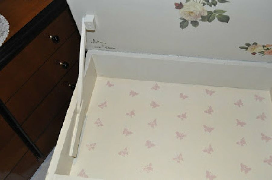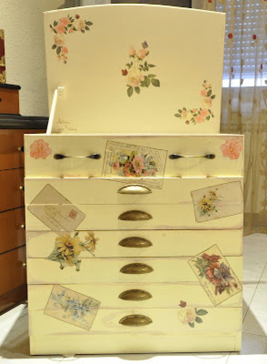 Terminado la parte de carpintería, ya solo quedaba decorar el costurero, de lo que se encargó su mujer. Para ello, forró el interior de los cajones con papel pintado y pintó el exterior siguiendo las técnicas del estarcido, el craquelado y el decoupage.