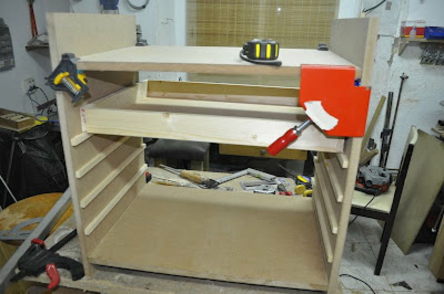 La primera parte para fabricar un costurero es sencilla, tomar medidas y cortar los tablones de madera. Para no equivocarnos, lo mejor será elaborar un esbozo a escala con la idea que tenemos en mente, o basarnos en las medidas de otro mueble que tengamos en casa. Así, antes de montar la estructura, Abubu62 colocó las guías de los cajones en los laterales.
