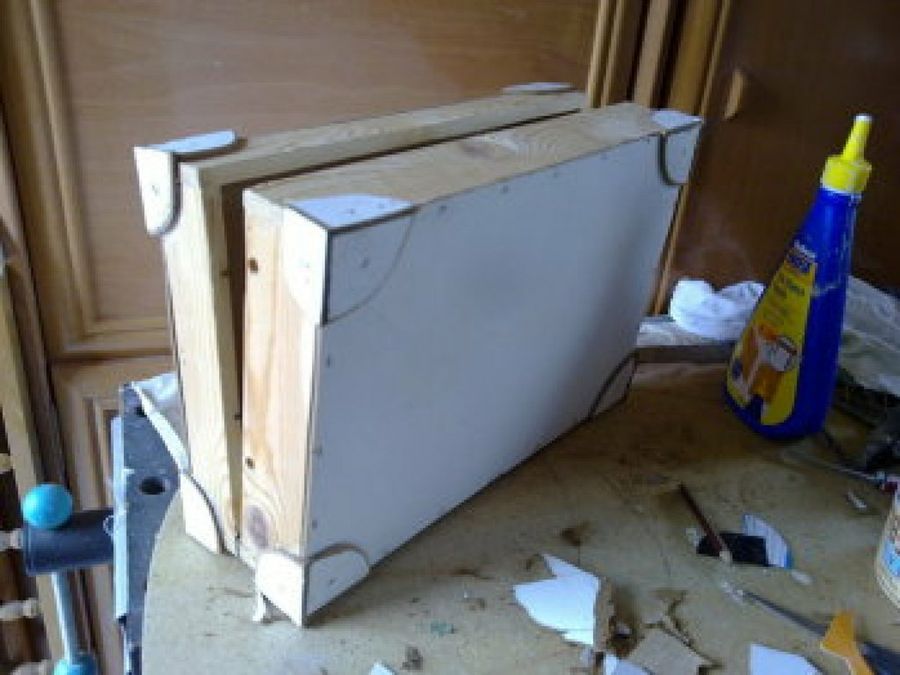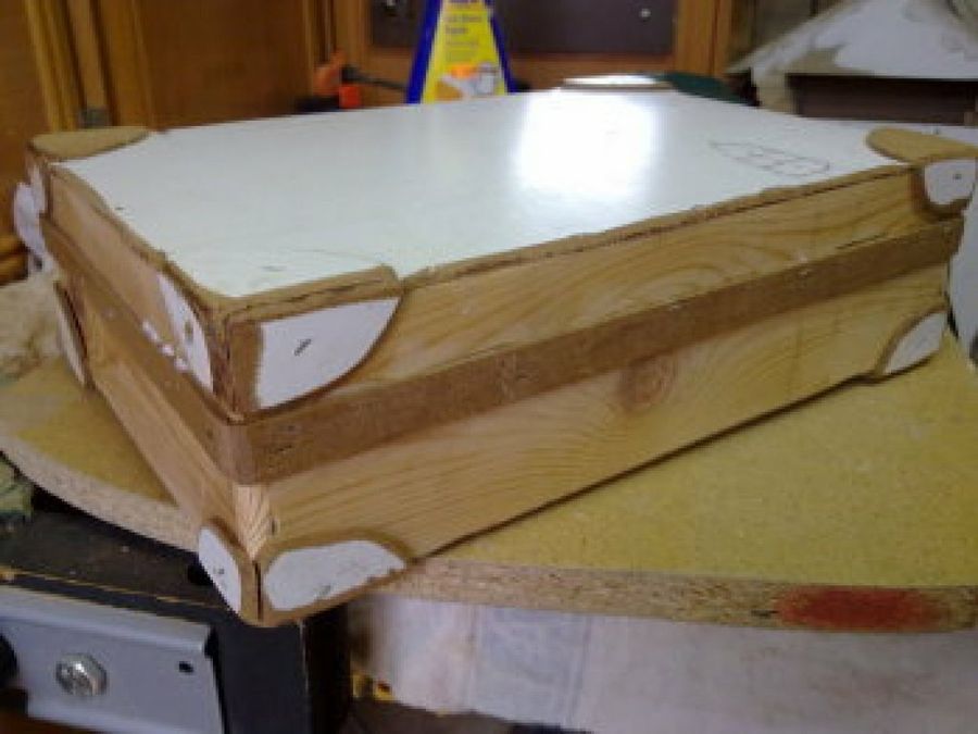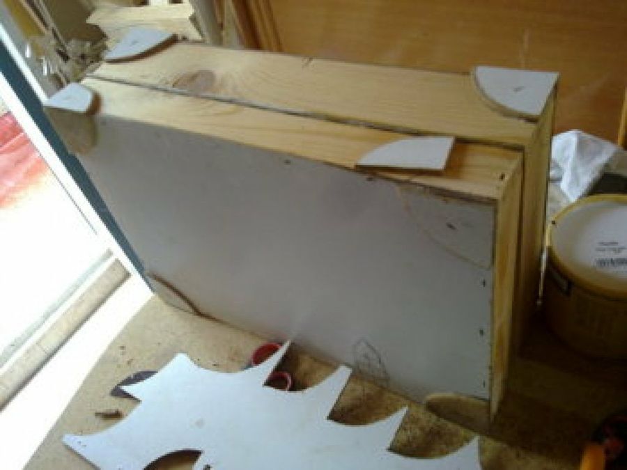 4 Una vez tenía la estructura montada, comenzó con la decoración. La intención de Kovakk, como ya hemos comentado, era dar un toque a maletín antiguo. Por eso, decidió emplear otra chapa de madera para crear detalles en las esquinas, que unió con un adhesivo.