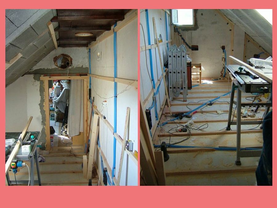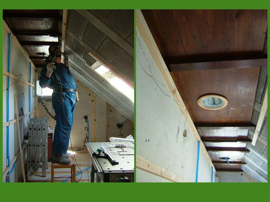 El marido de Cristall hizo toda la instalación de la luz. Podemos apreciar las paredes y el techo ya con los rastreles, es decir, listones de madera que servirán de marco para los materiales aislantes, y a la vez como anclaje para el forro con lamas de madera.