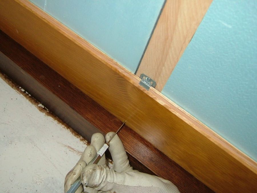 El artista, fijando los listones que harán de soporte reticulado. Observamos en el ángulo inferior derecho una excelente mesa de trabajo con sierra circular, accesorio que ha sido una ayuda valiosa ante la necesidad de revestir un espacio con piezas de muchas medidas diferentes.