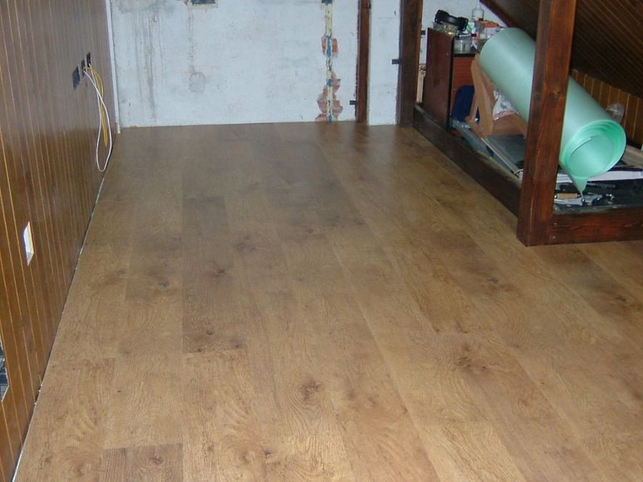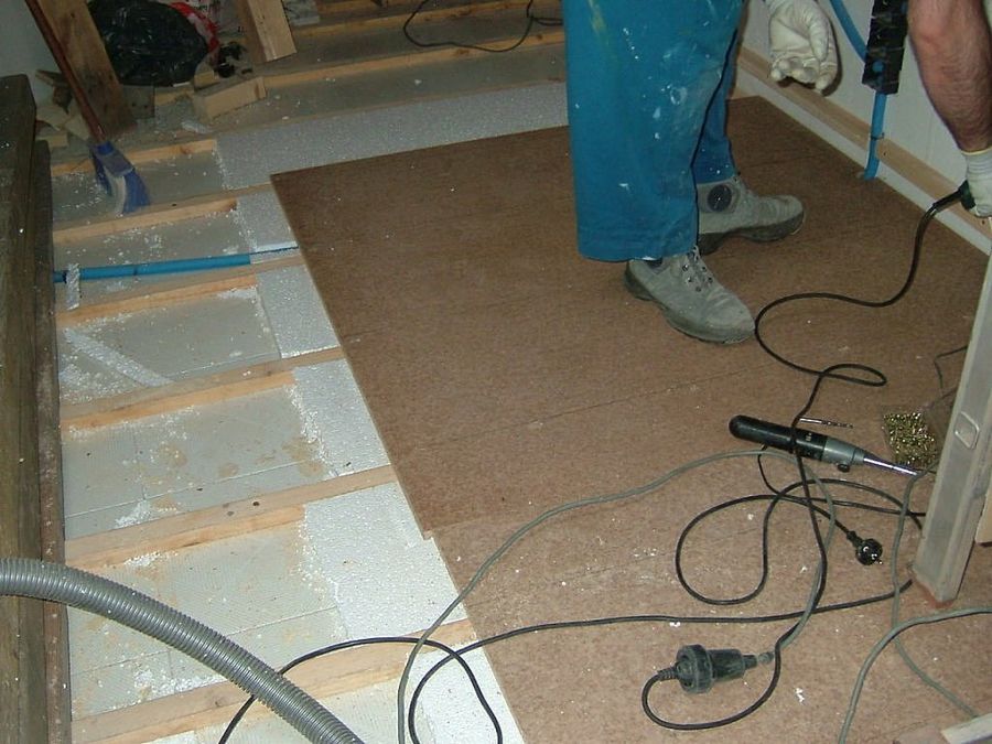 Aspecto del suelo ya con la base de aglomerado completamente montada. Dejaron a lo largo de toda la pared una junta perimetral de 1 cm, necesaria por las dilataciones. En esta parte del desván irá una cama, para la que el marido de Cristall hizo un bonito cabecero.