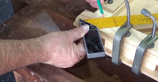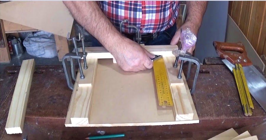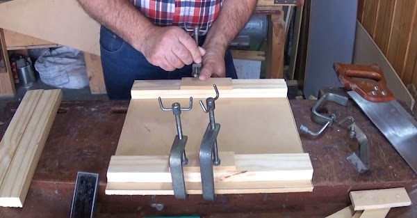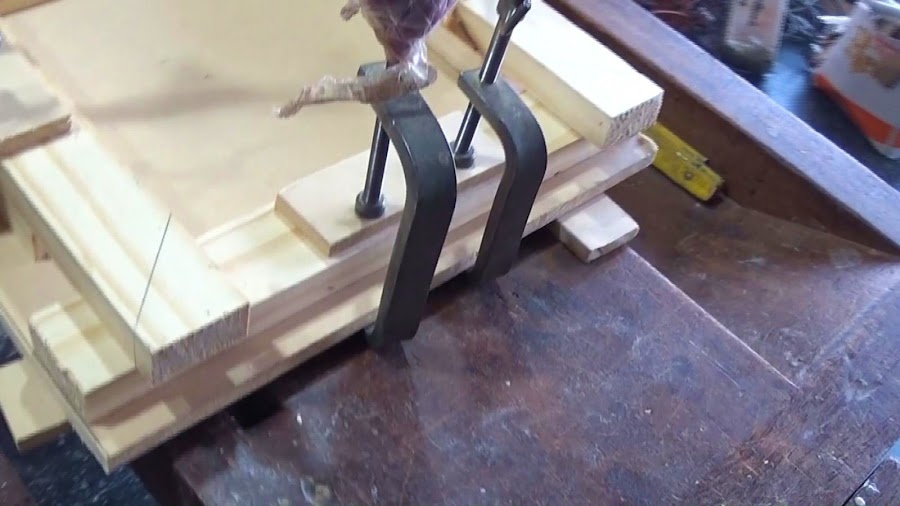 - Comenzamos colocando el primer listón ajustando bien fuerte con la prensa. Suplementamos con las plaquitas de MDF o madera para que no raye la superficie de éste.