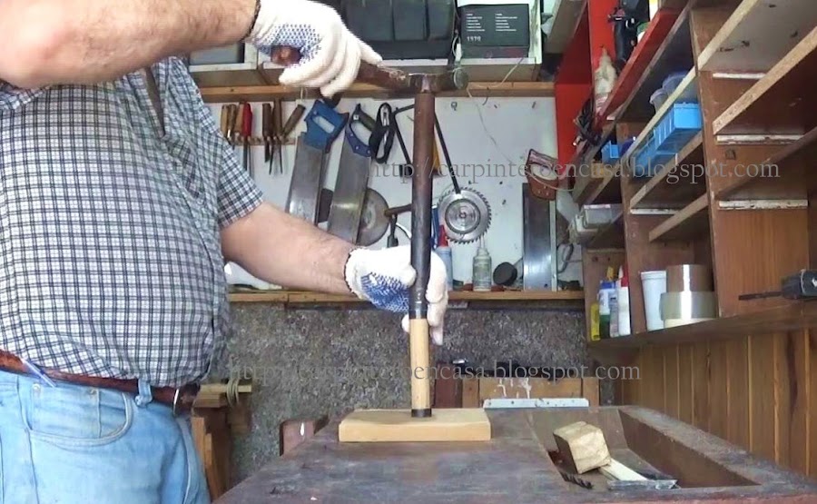 Colocamos la punta contra una madera, y golpeamos con firmeza con el martillo hasta que el cuello del perno haga tope contra el extremo del mango.