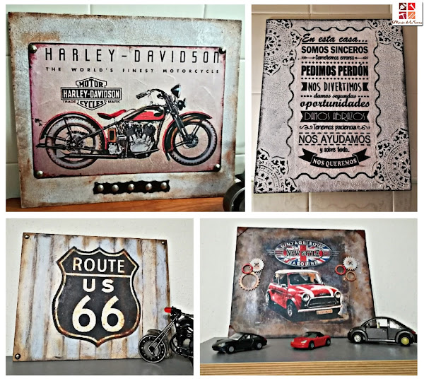 Para hacer estos carteles lo que necesitamos practicamente son tableros de dm o contrachapado que venden en tiendas de bricolaje, tamaño folio más o menos y aparte de pinturas, barnices y adornos, las fotos o motivos que deseéis , bien sean con servilletas o papel de arroz o también imprimiendo vuestras propias imágenes en la fotocopiadora.