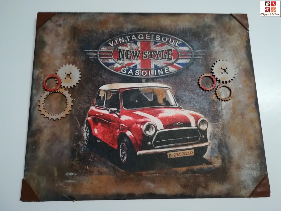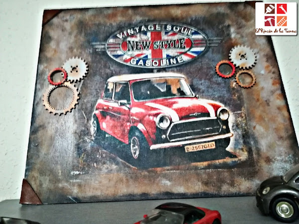 En esta ocasión he imprimido igualmente en papel de arroz un motivo de un coche, el mini y la imagen de la ruta 66 , este cartel ya lo hice hace tiempo para el día del padre pero gustó tanto que he vuelto a repetir.