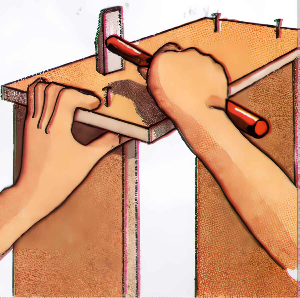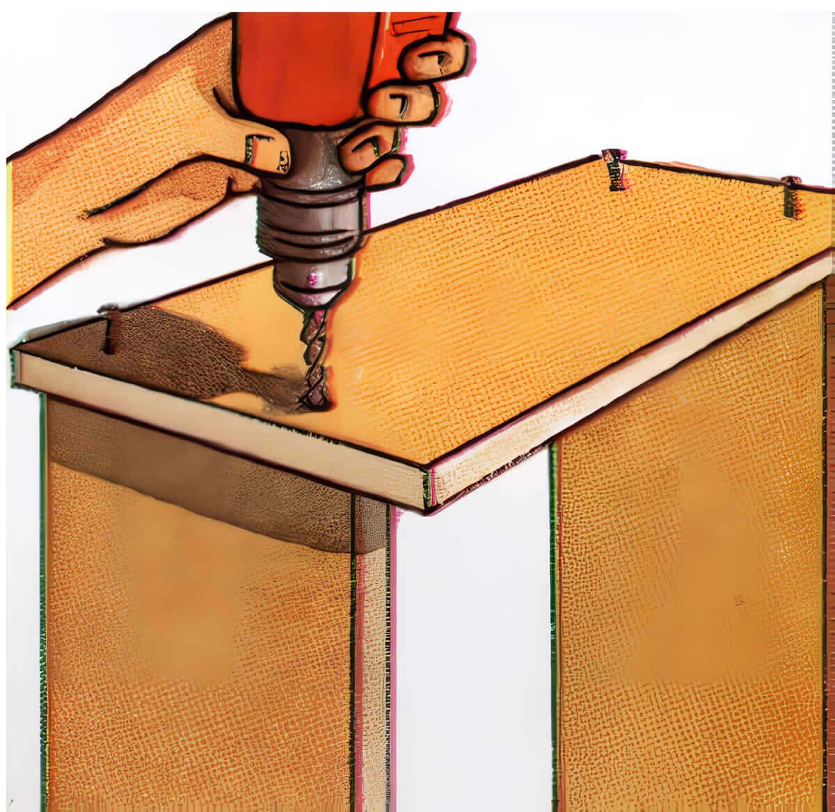 Para hacer la unión superior, encole los cantos de las tablas superponga las piezas más pequeñas.Sujétela con unos clavos. Para la unión inferior, encole de nuevo los cantos a la pieza inferior y péguela a las tablas, por su parte interior.