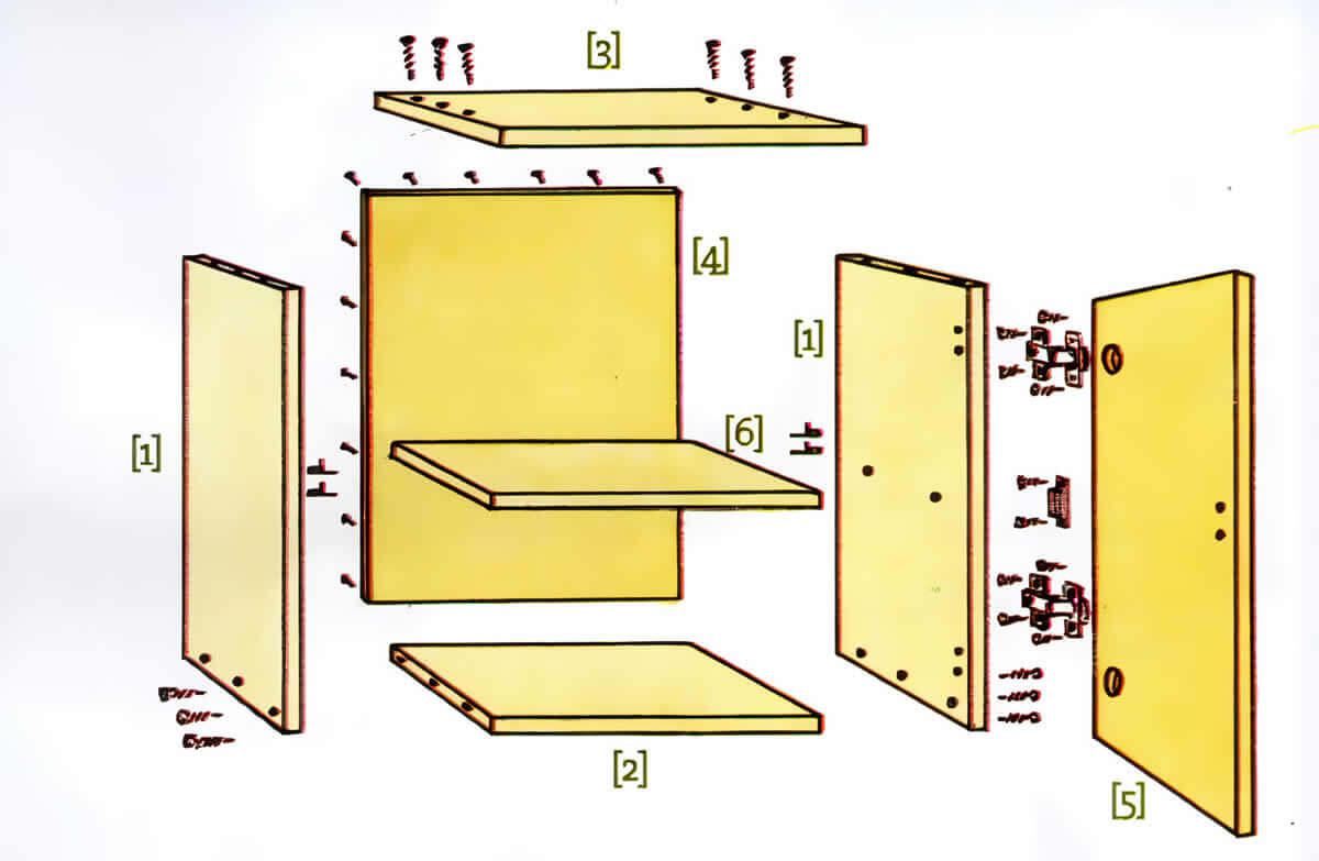 Dos tablas de compensado, pieza superior e inferior de madera compensada, una puerta de compensado, uno o dos estantes (opcional), clavos, cola blanca, taladro eléctrico, tornillos de cabeza plana, destornillador, punzón, escuadra, papel de lija, dos bisagras ocultas y cerradura magnética.Dificultad