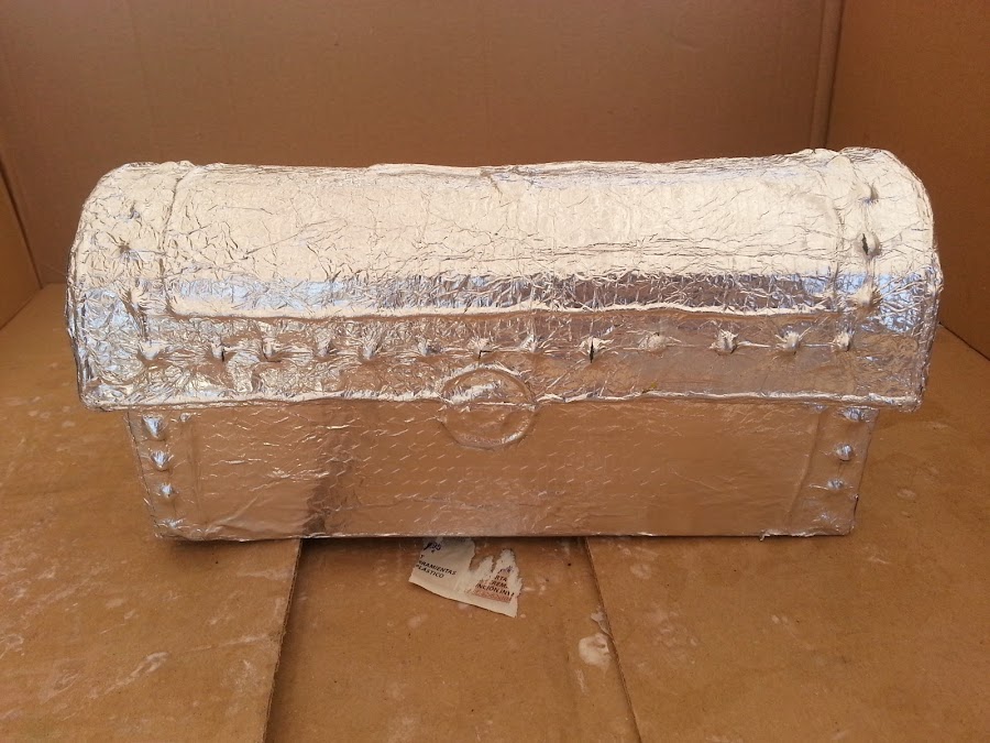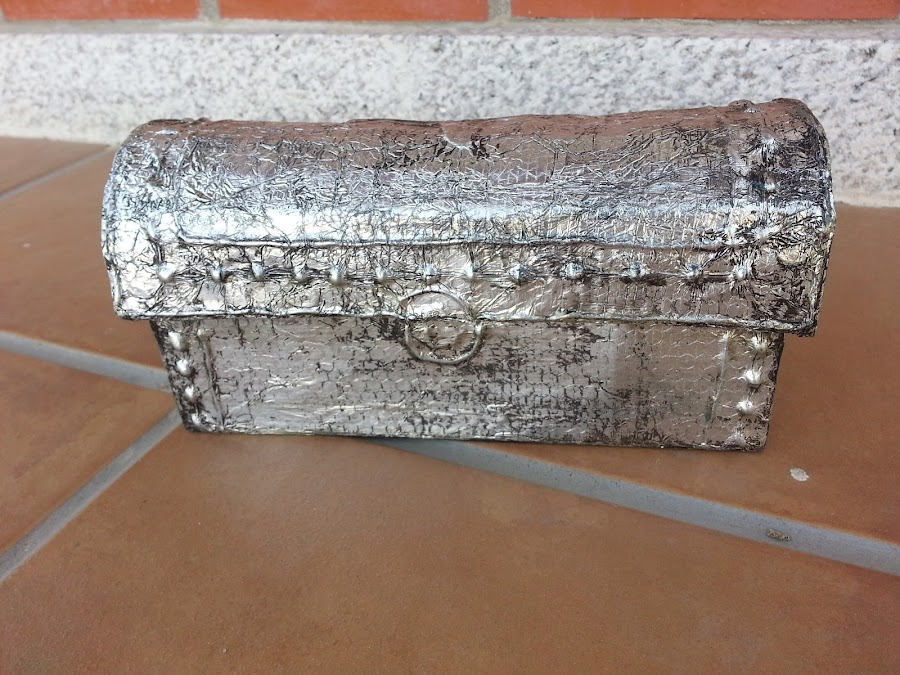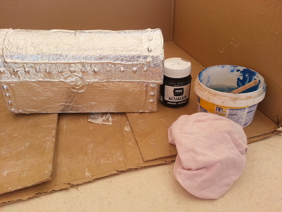 Como ya expliqué antes partiendo de una simple caja de zapatos, nos dispusimos mi hijo y yo a construir un baúl pirata de plata, valga la estrofa....jajajaa!!!.