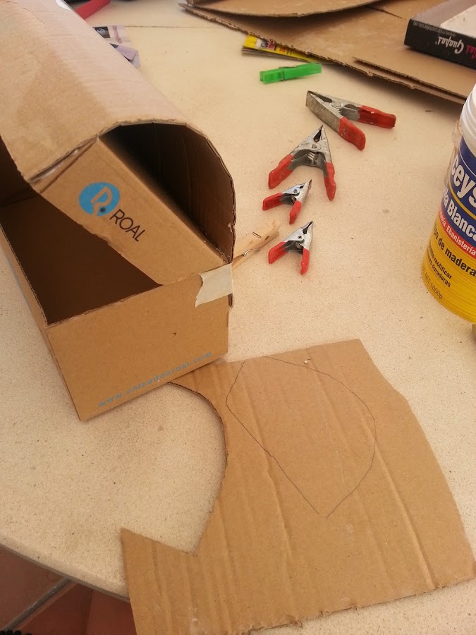 En esta foto las pinzas sujetan el cartón que pegamos con cola de carpintero.