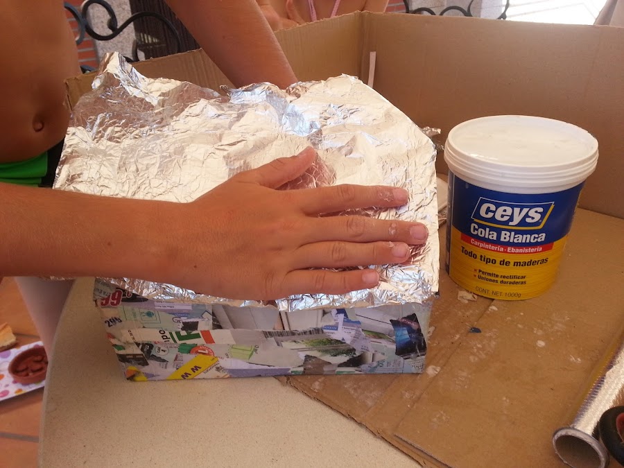 Con la cola de carpintero que se ve en la foto, se va pegando el papel de aluminio. Presionando con mucho cuidado sobre los relieves para que estos marquen la forma en el aluminio.