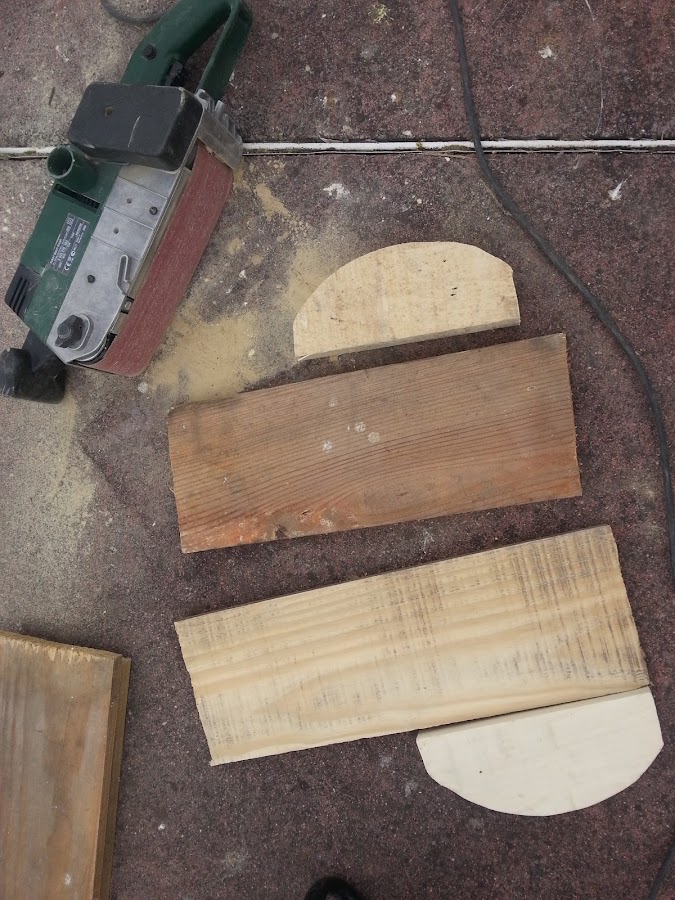 Con madera de palet, y con ayuda de una lata para trazar los semicírculos voy consiguiendo las piezas de la tapa.