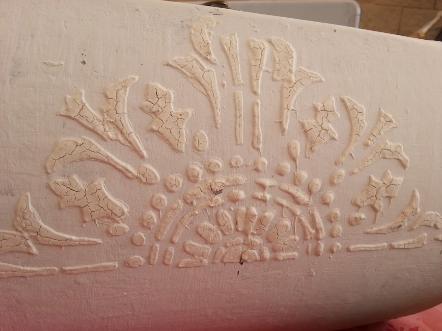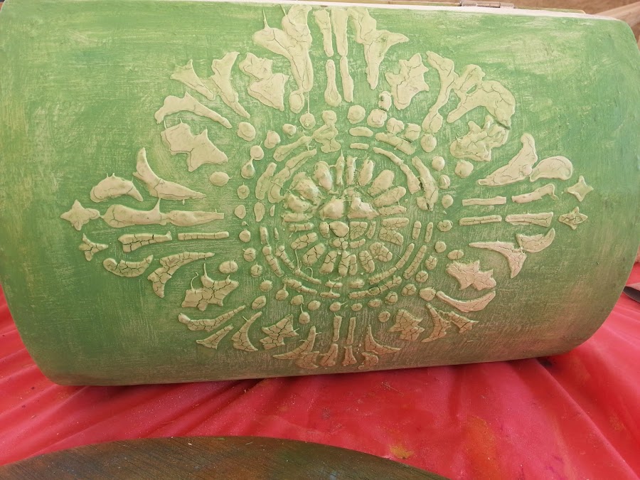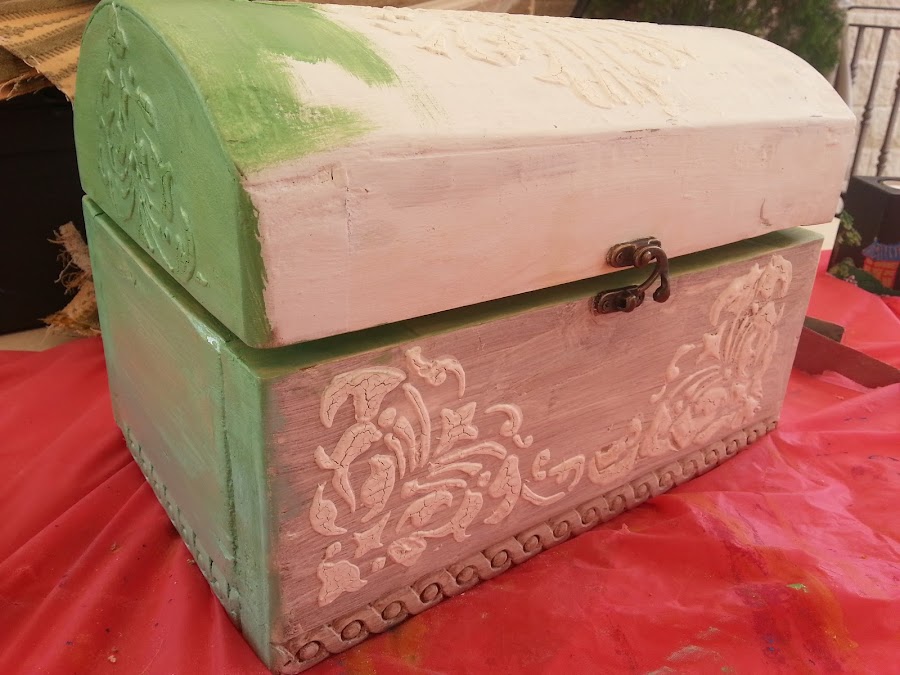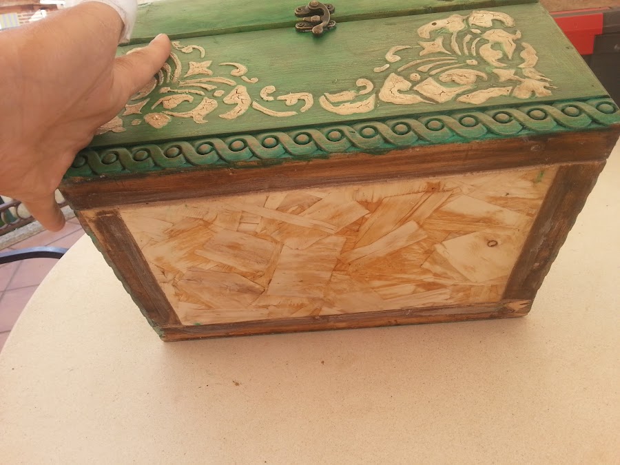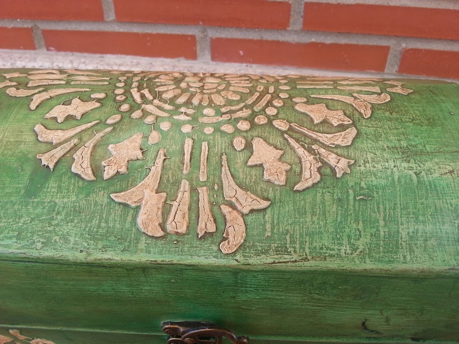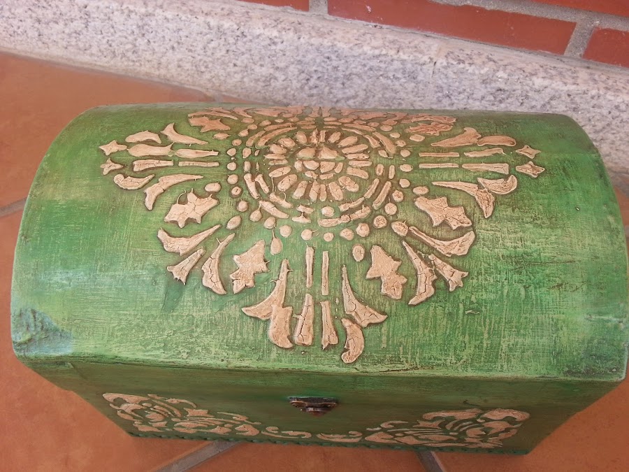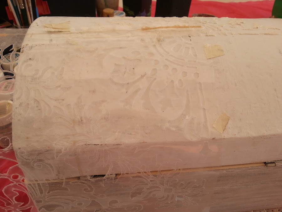 Esta es la foto de la tapa del cofre con medio stensil realizado. Se aprecia como se cuartea.