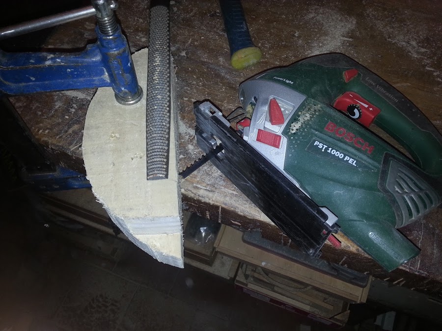 Sierra de calar, escofina y gatos para fijar al banco de trabajo, mientras corto y limo. Las piezas van tomando forma.