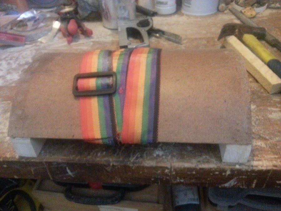 Mientras se seca el cartón piedra la pongo un gato de cinta, para que ayude a dar la forma curva de mi cofre.