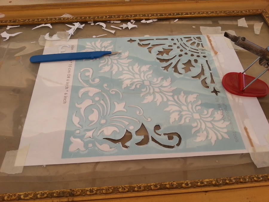 Ahora en esta foto estoy preparando la plantilla de stensil con un plástico de una caja, lo pongo sobre un cristal y debajo la plantilla, con el soldador eléctrico voy quemando para sacar las siluetas y también me ayudo con un bisturí .