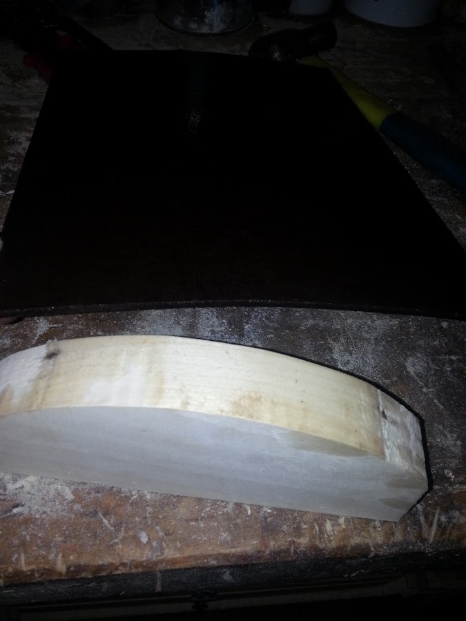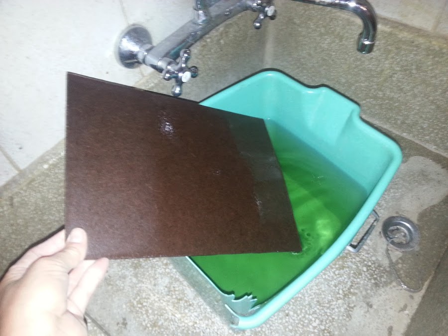 Ya se que las fotos son muy malas, pero es lo que tengo. En ella al fondo se ve el cartón piedra humedecido, y en la parte delantera vemos una pieza del lateral de la tapa.