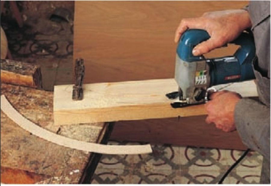 3 Para cortar la base y obtener así la pieza circular que se necesita, se utiliza una caladora eléctrica. Antes de hacer el calado es importante fijar con firmeza la pieza cuadrangular sobre la superficie del banco de trabajo, mediante uno o dos gatos, y teniendo cuidado de dejar parte de la pieza en el aire para que la caladora pueda actuar con facilidad y sin peligro de ser aserrada la superficie del banco.