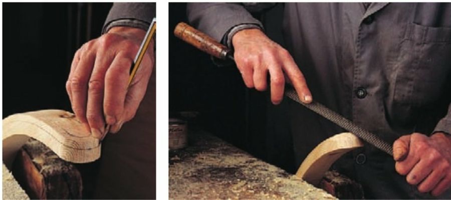 12. Para el pulimentado de la cara superior de curvatura convexa se utiliza un cepillo, que se deslizará en movimientos cortos y tangentes en el sentido de la fibra y siguiendo la forma de base. Esta operación se hace con la pieza debidamente fija al banco de trabajo por medio de su tornillo.