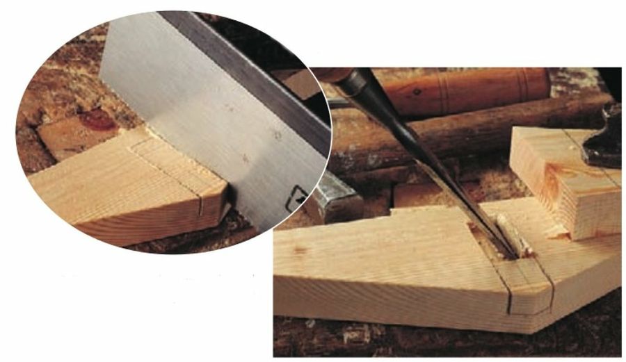 18 Para hacer el calado correspondiente al ensamble a media madera, primero se corta todo lo posible con un serrucho de costilla, sin pasarse de la marca superior del encaje ni de la profundidad ya trazada de 1 cm. Esta operación se hace con la pieza debidamente fija al banco de trabajo por medio de un gato.
