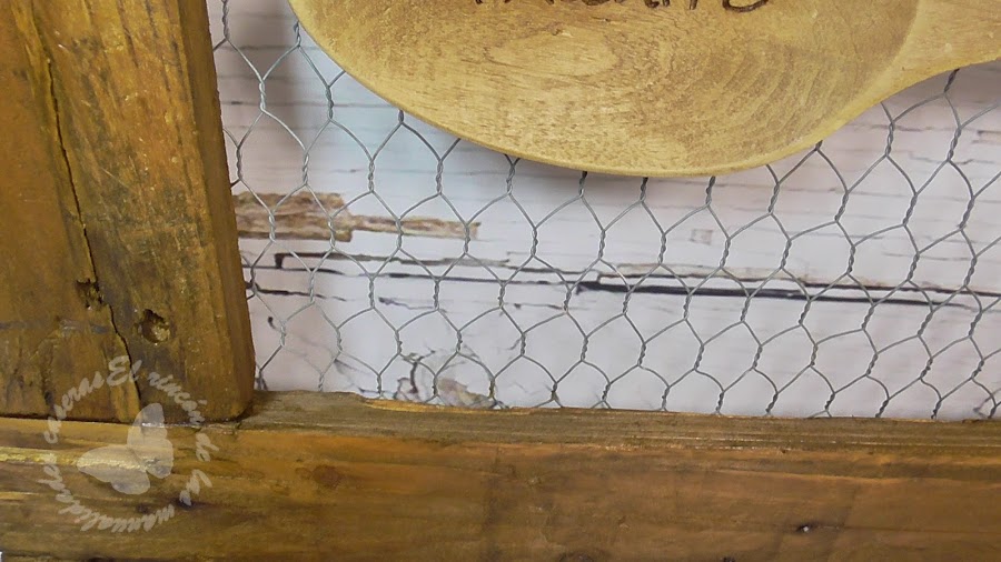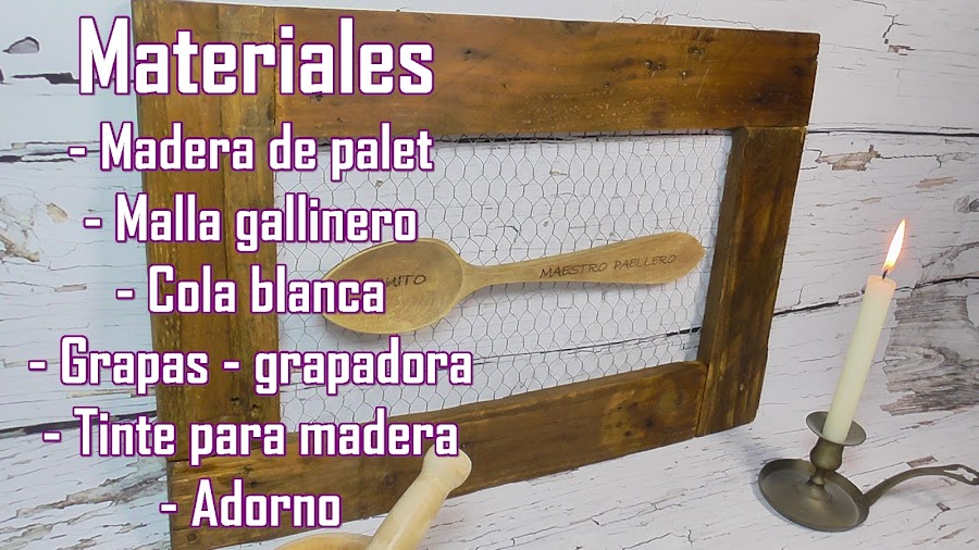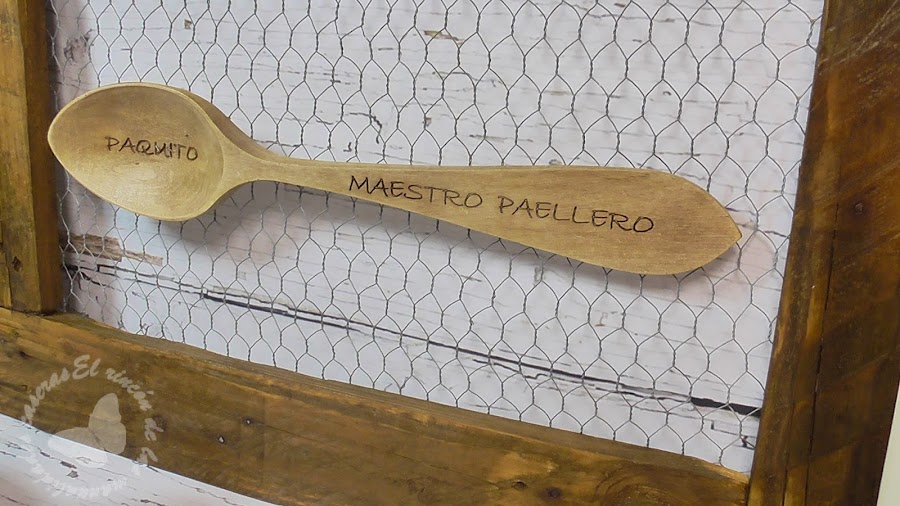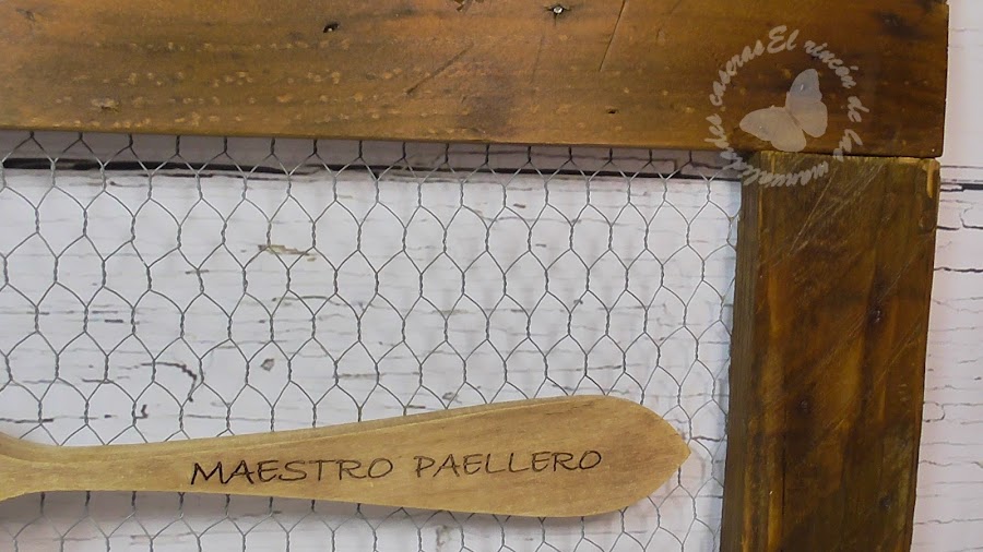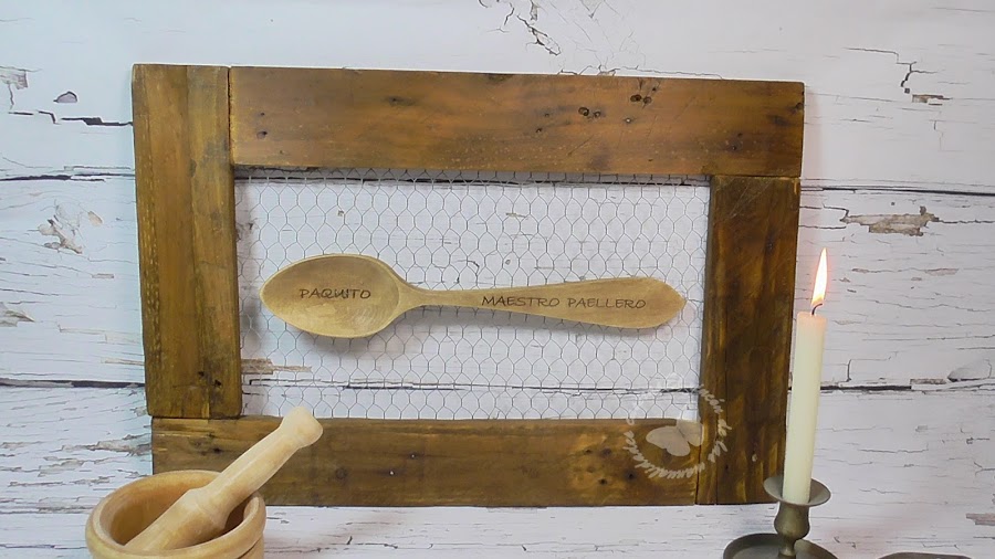 A mi marido los amigos en su cumple le regalaron esta cuchara de madera dedicada (peloteo total para que les siga haciendo paellitas, que le salen muy buenas jijiji)....y llevaba en mente hacerle un marco pero no sabía como, lo único que tenía claro era que lo quería en estilo rústico, paseándome por Pinterest vi como con listones de madera de palet hacían maravillas y pensé que era un material perfecto para hacer mi marco, después vi armarios antiguos donde se colocaban a secar los embutidos y estaban hechos con madera y malla de gallinero y me gustó la idea, podía quedar muy rústico y además reciclaba, que si me vais conociendo sabréis que me encanta reciclar, así que teniendo claro los materiales solo me quedaba darle forma.
