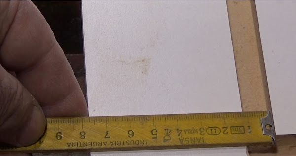 Trasladamos la medida de la marca que hicimos hasta el borde de la placa, directamente a la máquina. Apoyamos el metro en la base y medimos deste la guía tope hasta el borde de la fresa.