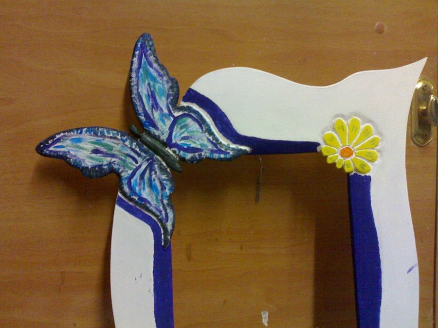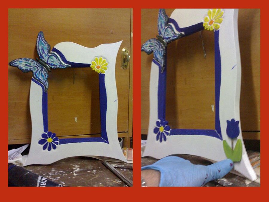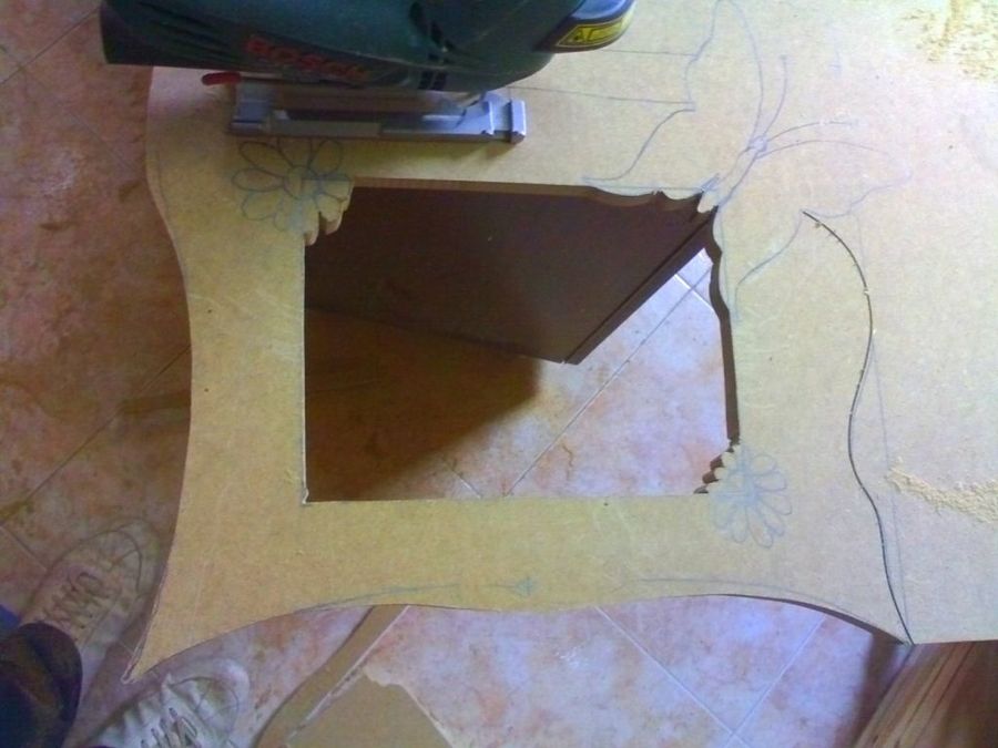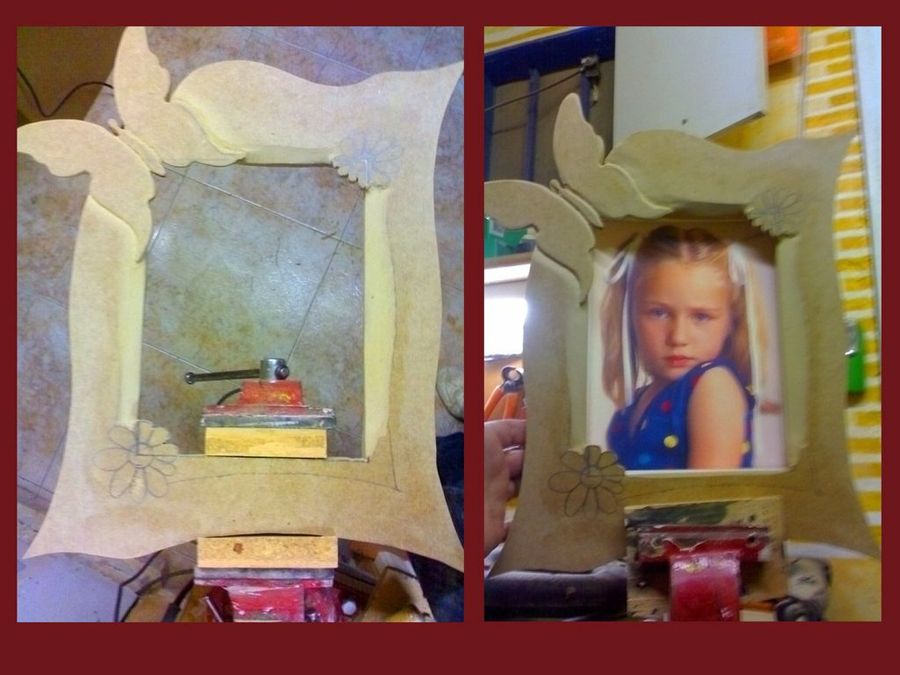 Kovakk abre el hueco donde irá la foto con la sierra caladora, delineando cuidadosamente los pétalos de las flores y las alas de la mariposa, que asoman por los ángulos. Este detalle confiere mucho atractivo al diseño, parecerá que los adornos han brotado espontáneamente en el marco.