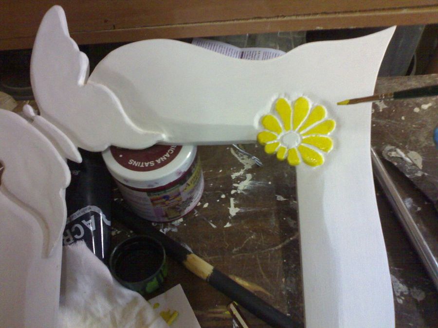 Terminado el trabajo mecánico con las herramientas de corte y pulido, da comienzo la fase de pincel. Nuestro amigo da una mano de pintura blanca, para colorear a continuación los adornos.