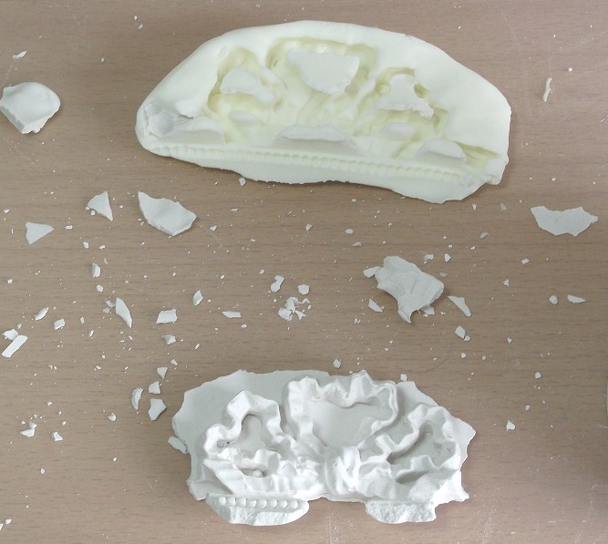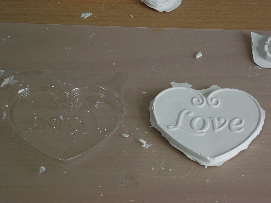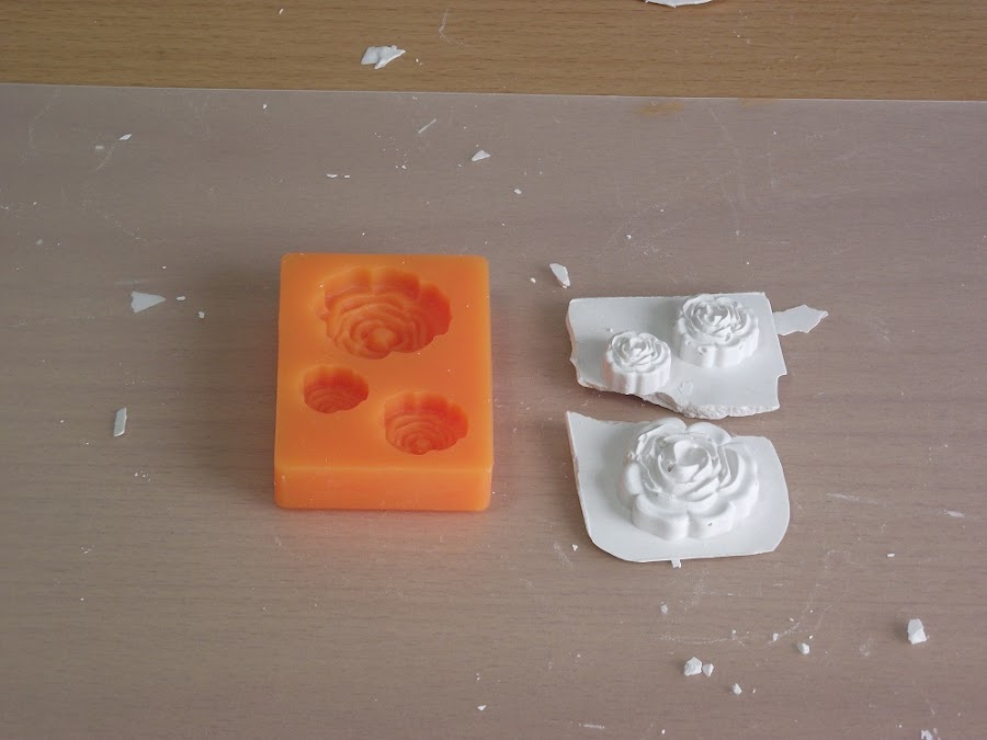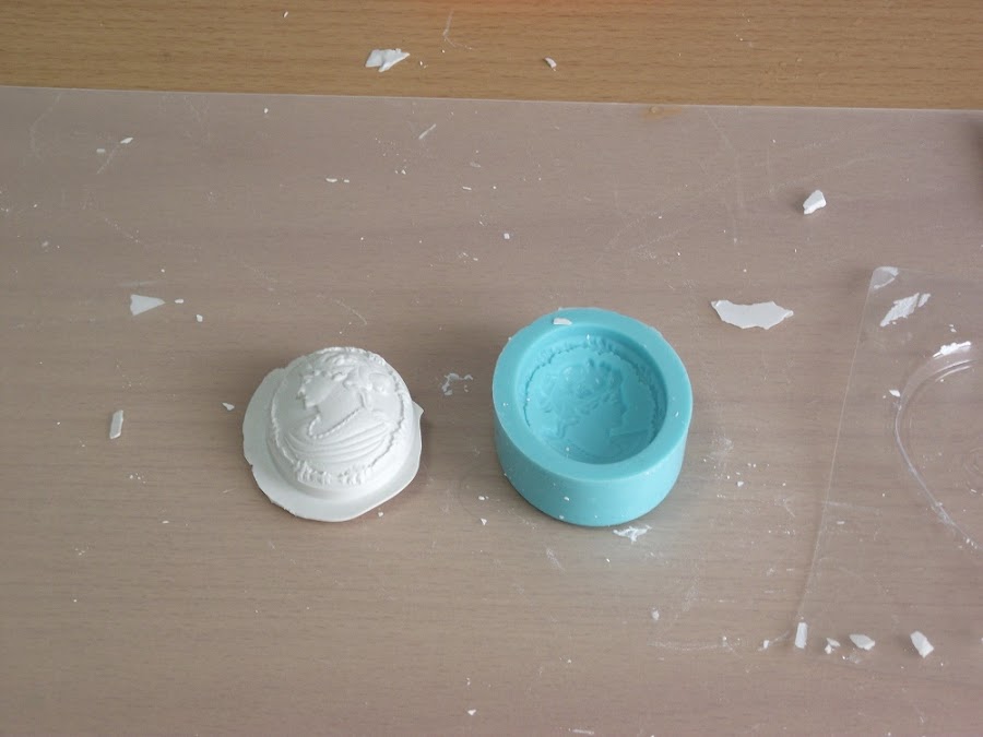 Una vez tuve el molde hice la pasta con la escayola, siguiendo las instrucciones del paquete. Después rebajé la pasta con más agua, para que quedase como una crema y se metiese por todos los recovecos del molde. Como salió mucha cantidad decidí utilizar también estos moldes, que son de repostería.
