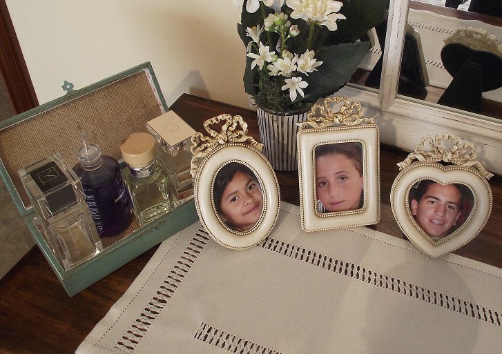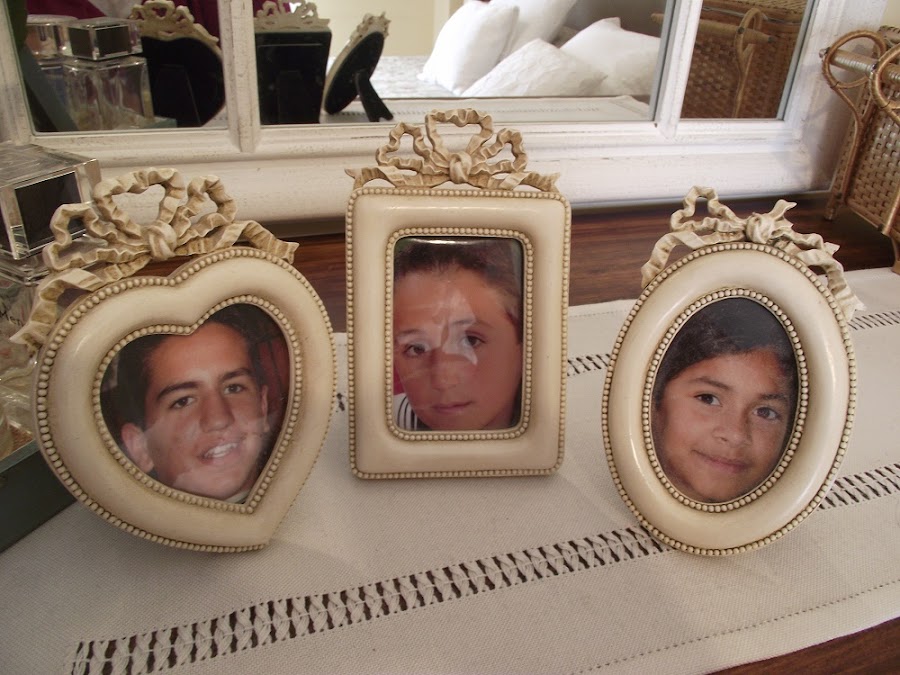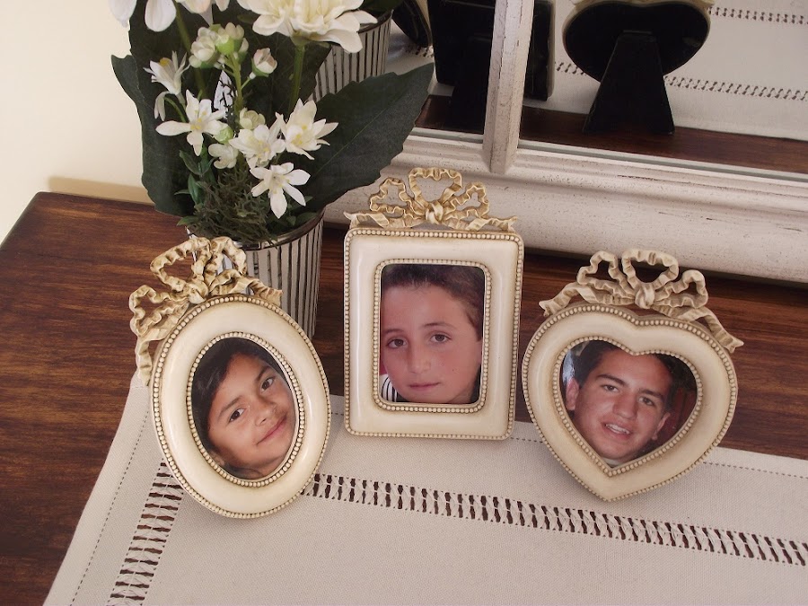 Estuve tentada de poner fotos actualizadas de mis hijos, pero me parece que a estos marcos tan pequeños y con ese toque tan romántico le quedan mejor las fotos antiguas, con sus carinas de niños. Así es que así se van a quedar.