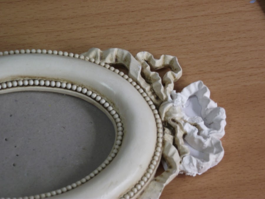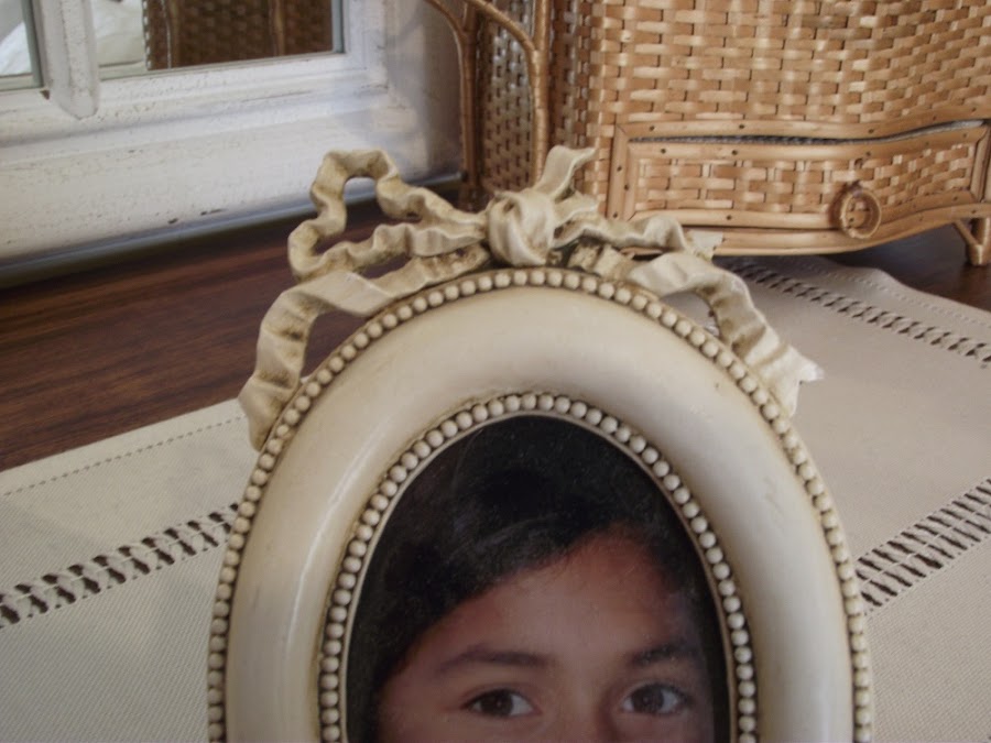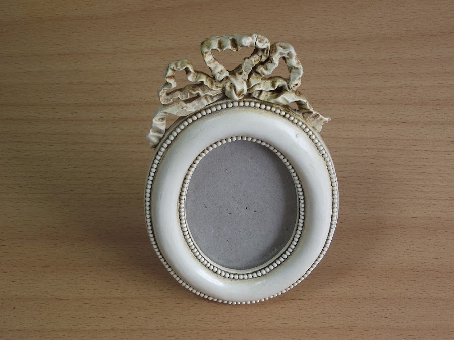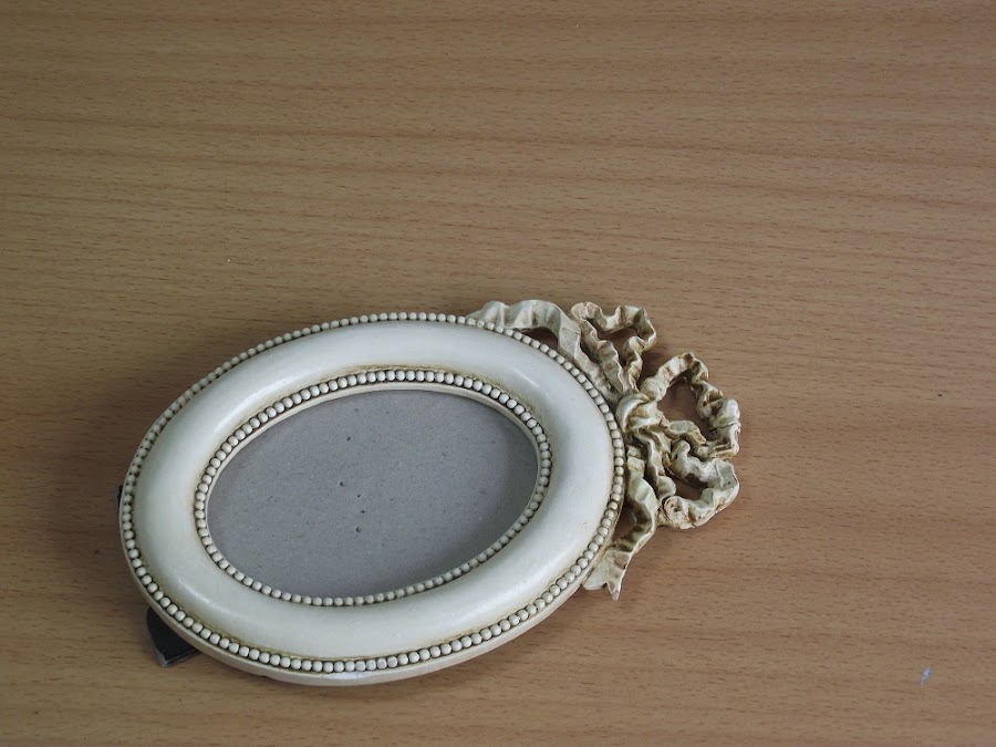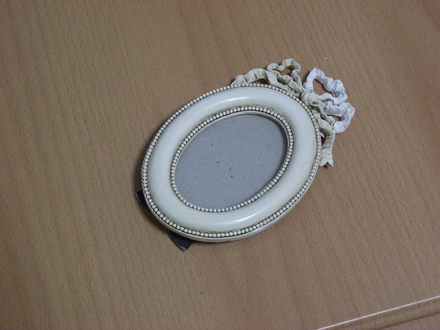 Pero al poco tiempo de tenerlos el marco ovalado se cayó y se rompió el lazo que lo adornaba. Varias veces he pegado el trocito de lazo, pero el marco es muy inestable y se cae una y otra vez. Al final he perdido el trozo de lazo y así lleva un montón de tiempo.