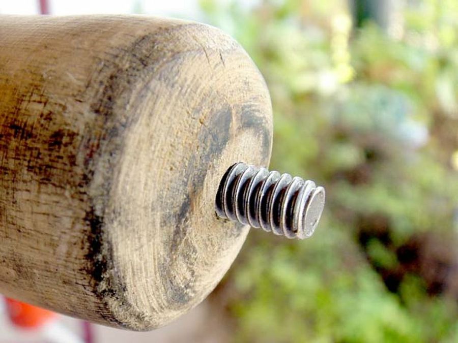 Nuestro bastón es de una madera excelente, se nota en el borde limpio del taladro. Metemos el tornillo por el lado serrado, le ponemos la tuerca ciega y con cuidado vamos apretando con una llave fija. Conviene quitar el sargento y sujetar el bastón con la mano, para notar la resistencia; si es demasiado fuerte, sacaremos el tornillo con el alicate, lo untaremos con jabón y volveremos a enroscarlo.