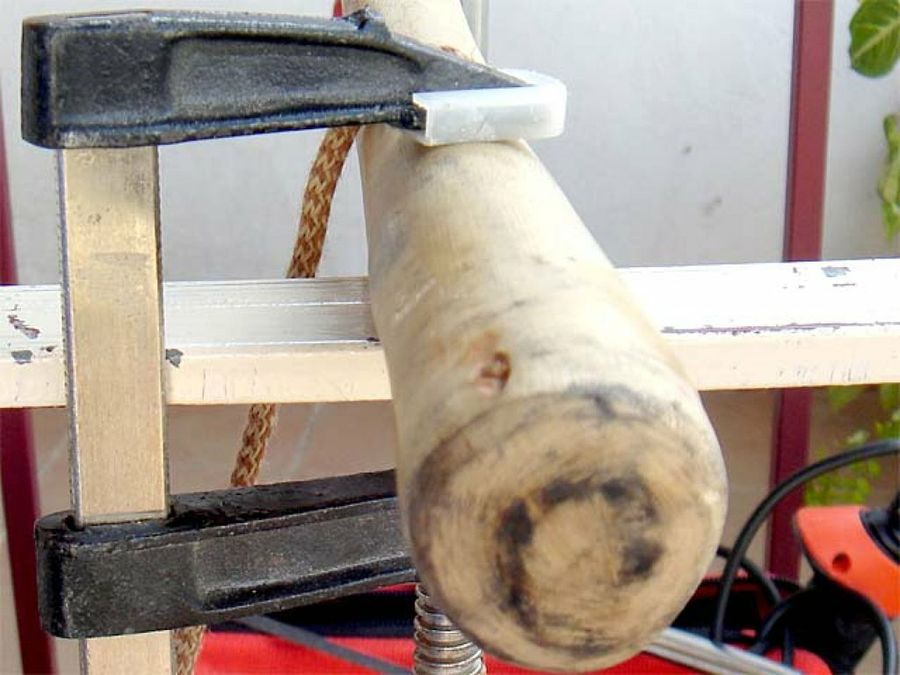 Con dos sargentos sujetamos fácilmente nuestro bastón en el marco de una mesa de jardín, para hacerle el taladro. A continuación, cortamos la cabeza del tornillo, para dejar sólo la parte que nos sirve.