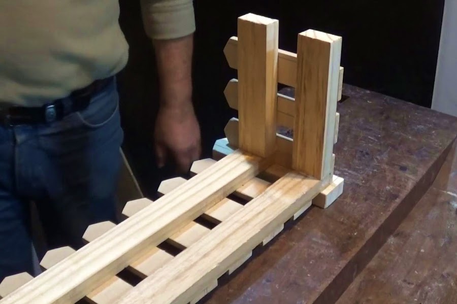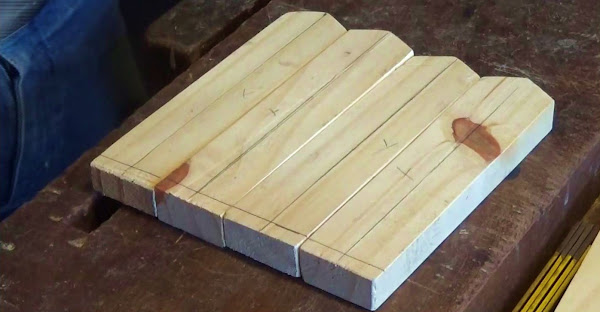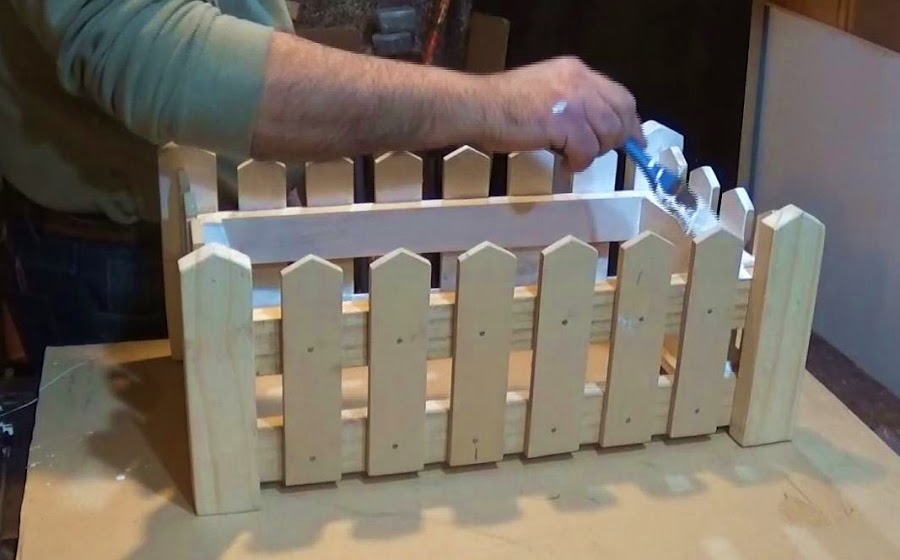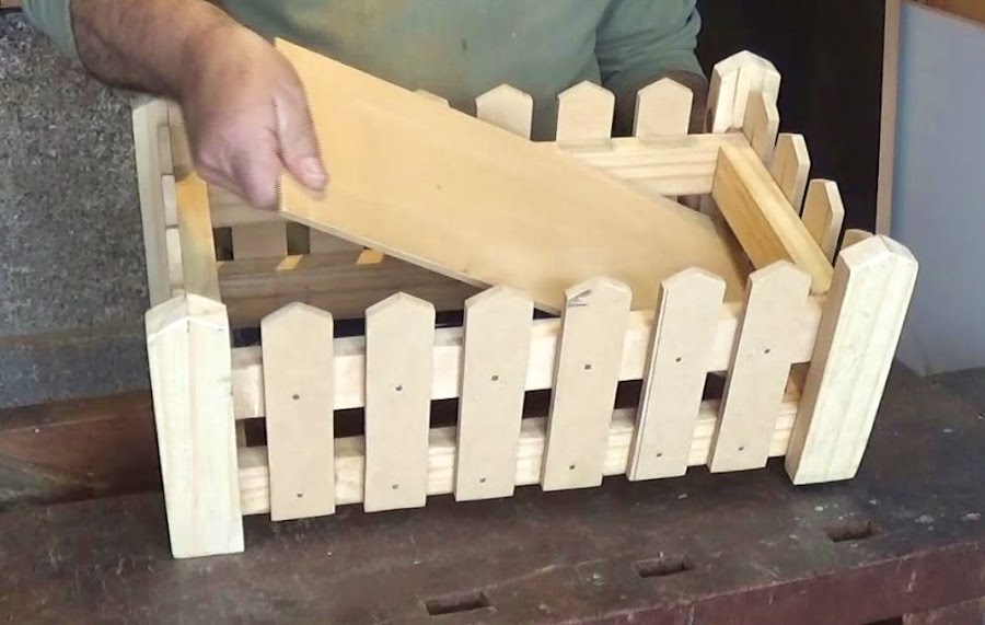 Cortamos en forma de " V " invertida en los extremos de todas las piezas que irán paradas en el cerco del macetero, tanto las esquinas como los intermedios, lo haremos manualmente, con caladora o con cualquier tipo de sierra eléctrica.